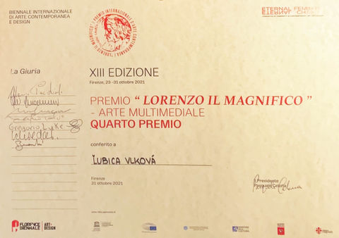 2021 Ocenenie 4. miesto v kategórii New media art, za výtv. prácu na medzinár. výstave XIII. FLORENCE BIENNALE, Firenze, Fortezza da Basso, Italy